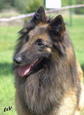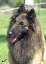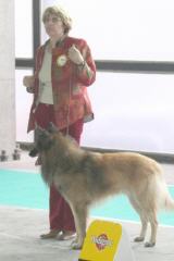3 jährig. Rüde mit kompl. Zangengebiss, vorzüglicher Typ, langer Kopf mit parallelen Linien, mittelgroße, gut angesetzte Ohren, dunkle mandelförmige Augen, guter Hals, gute Körperproportionen, gute hintere Winkelungen, vordere Winkelungen könnten besser sein, kräftiger Rücken, in der Bewegung sehr gut, gutes Haarkleid und Farbe