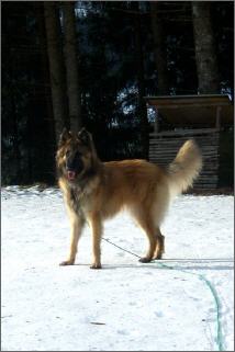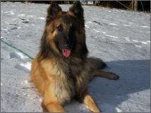 "9 Monate alter korr. aufgebauter Rüde, Scherengebiss, gute Kopfproportionen, Augen von guter Farbe, korr. Winkelungen, schöne Linien, Bewegungsablauf d. Jugend entsprechend, offenes Wesen"