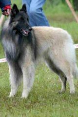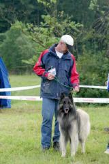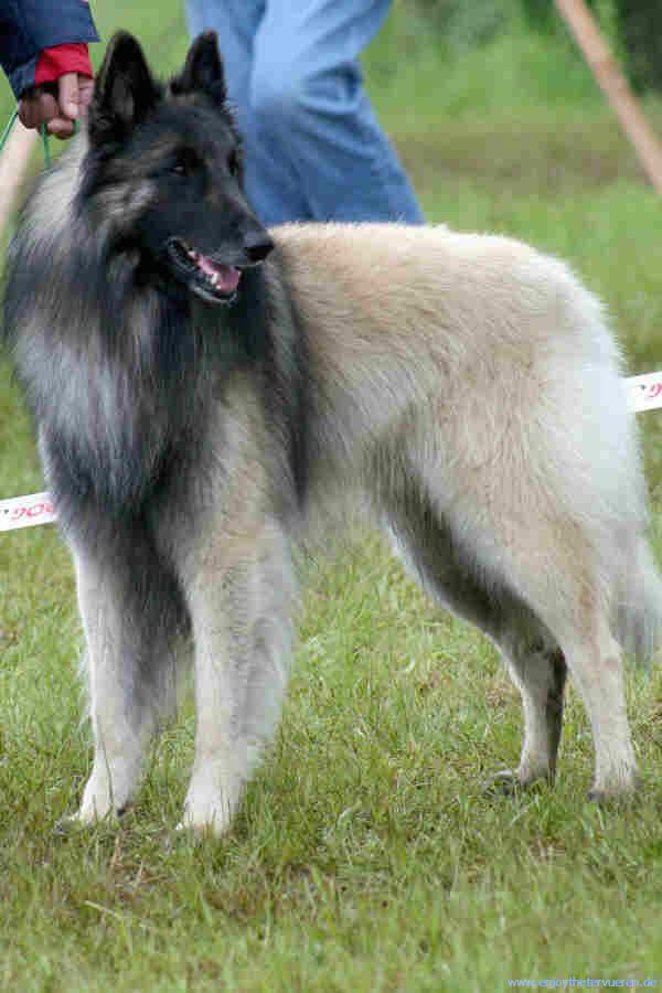 4jähriger, eleganter Rüde, guter Knochenbau, gute Substanz, harmonische Erscheinung, gut gebogener Hals, schön abgesetzter Widerrist, etwas lang in der Lendenpartie, fester Rücken, gute Kruppe, gute untere Linie, gut aufgezogener Bauch, vorzügliche Fellstruktur, gute Farbe und Charbonnage, vorzüglicher Kragen, mittellanger, ausgewogener Kopf, Fang von guter Länge, etwas tief im Profil, gut gespaltener Fang, Fang sollte etwas kräftiger sein, Augen dunkel ausdrucksvoll, von guter Form, sollten schräger eingesetzt sein, Ohren vorzüglich, gut angesetzt, gut getragen, Rute etwas hoch angesetzt, vorzügliches Wesen, ausgreifendes Gangwerk, guter Schub, leichtfüßiger Bewegungsablauf, Rute lustig getragen in der Bewegung.