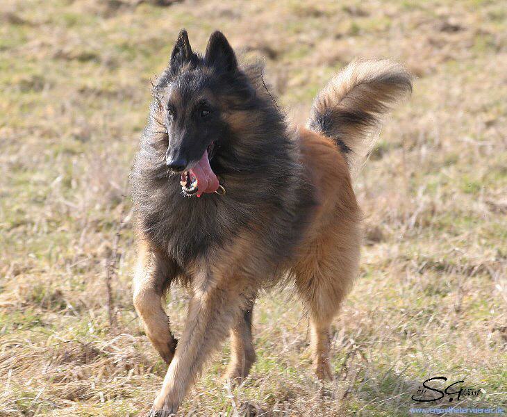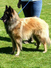 Komplettes Scherengebiss, eleganter, kleiner Rüde, 17 Monate alt, mittellanger, eleganter Kopf mit gutem Ausdruck, gut getragene Ohren, ein bisschen breit an der Basis, schöne parallele Kopflinie, Stopp muss sich noch entwickeln, schönes Pigment, könnte mehr Hals bekommen, gute Rückenlinie, leicht abfallende Kruppe, gute Winkelungen hinten, ein bisschen steil in der Vorhand, gute Brusttiefe sollte mehr Vorbrust haben, gute Knochen, schöne Katzenpfoten, geht hinten und vorne etwas eng, noch lose in den Gelenken, Rute zu hoch getragen, freundliches Wesen, schönes, aber etwas trockenes Fell.