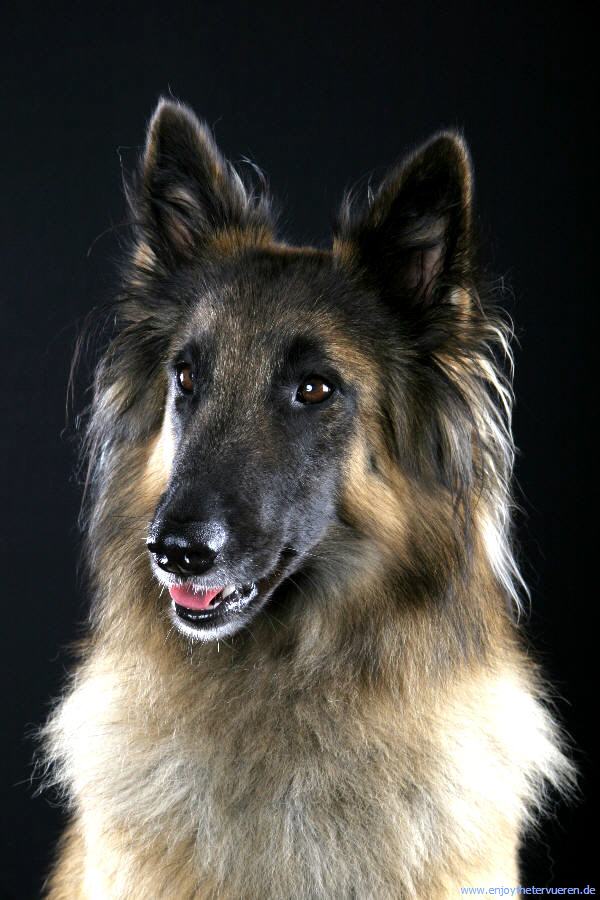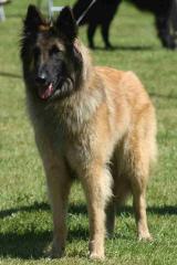 4 Jahre, vollständiges Scherengebiss, Hündin von guter Größe, guter Gesamteindruck, fauve mit sich entwickelnder Charbonnage, Körper nicht ganz quadratisch, langer Kopf, gute Pigmentierung, mandelförmige mittelbraune Augen, große Ohren, hoch angesetzt, Stirn etwas gerundet, gute Nackenlinie, gerade Rückenlinie, gut entwickelter Körperbau, etwas schwach in den Fesseln, Rute gut getragen, gutes Gangwerk. Titel "Herbstsieger an den Tervueren"