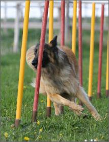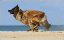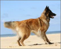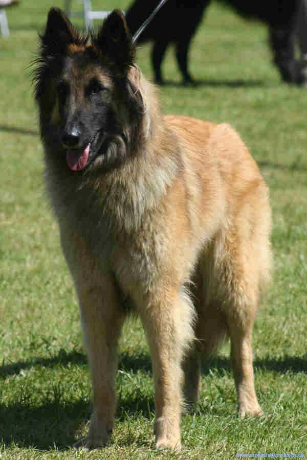 Komplettes Scherengebiss, gute Größe, fauve charbonniert, in guter Verfassung, mittellanger Kopf, dem etwas an Ziselierung fehlt, die Maske verwaschen, der Fang ist nicht genügend gespalten, mittellange Ohren, gut getragen, tiefe Ohrmuschel, der Oberkopf ist leicht gewölbt nach vorne abfallend, wenig Stopp, im Profil ist der Kopf konkav, gute Halslänge mit einem guten mittellangen Körper, insgesamt guter Körperbau, dem es noch etwas an Substanz fehlt, gute Winkelungen hinten, vorne steil, guter Knochenbau, schwache Fesseln, gute Pfoten, vorzügliche Vorführung, geht hinten und vorne eng, die Rute ist waagerecht getragen.