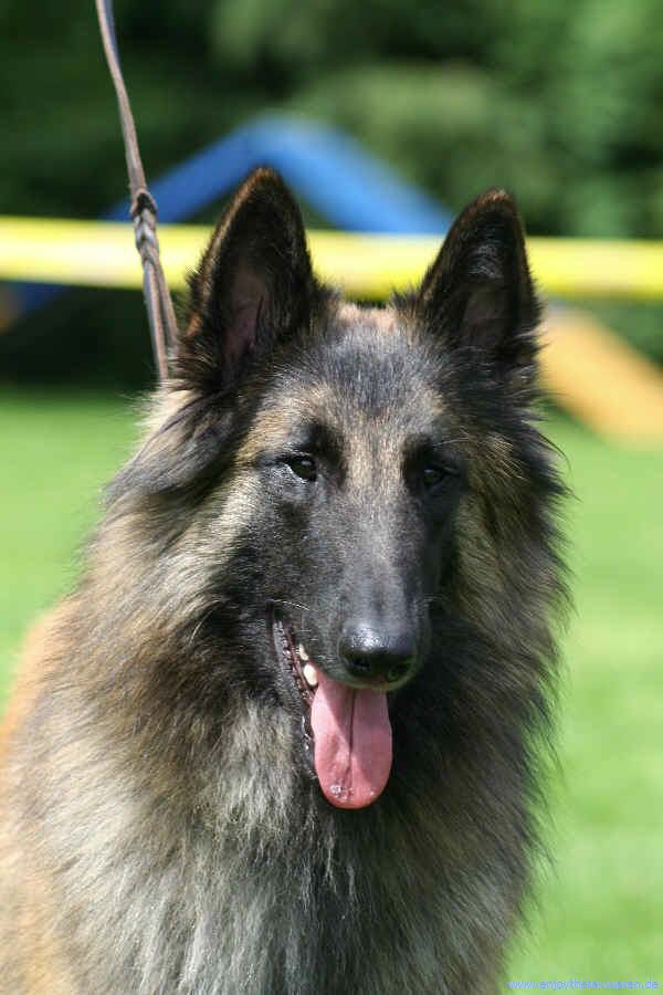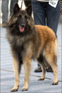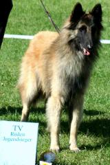 11 Monate, schon sehr gut entwickelter Rüde, sehr harmonisch, mit schönem Kopf, mittelgroße Ohren, sehr gut getragen, leichter Stopp, vorzügliche Pigmentierung, mandelförmige dunkle Augen, sehr gut eingesetzt, gerader Rücken, leicht abfallende Kruppe, Brust für sein Alter korrekt entwickelt, Bauchlinie in Ordnung, vorzügliche Winkelungen vorne und hinten, Fell von guter Qualität, braun mit Anflug, korrektes Scherengebiss, Rute korrekt getragen in der Bewegung, flüssige Bewegungsabläufe jedoch noch jugendlich, zeigt sich freundlich, sehr gute Vorführung,