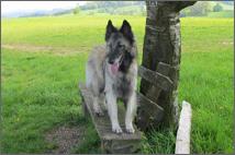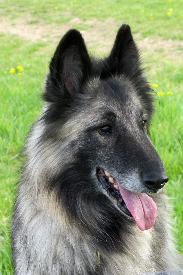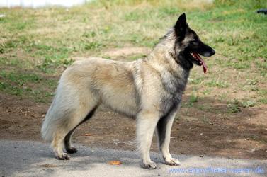 Graue Hündin, 9 Jahre, gute Größe, nicht ganz voll im Haarkleid, komplettes Scherengebiss, guter, langer Kopf, genügend parallel, gute Maske, vorzüglich ziseliert, Ohren etwas groß, aber gut getragen, schöne Hals-Rückenlinie, mittellanger Körper, vorzügliche Brust, leicht ausgedrehte Ellbogen, gut gewinkelt hinten und vorne, gute Kruppe und Rute, vorzügliches Wesen, geht gut, vorne etwas locker.