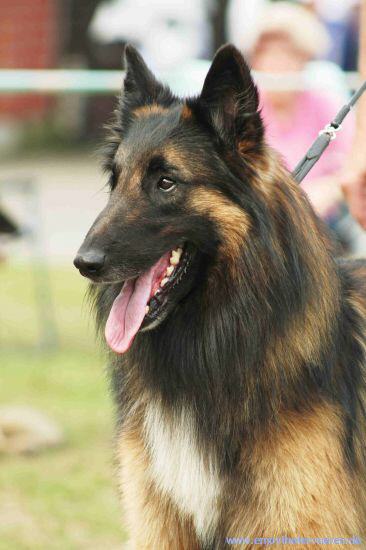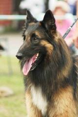 5jähr. Rüde, korrekte Zange, schöne parallele Kopflinien, mäßiger Stopp, schöne flache Stirn, Lefzen gut pigmentiert, Ohren dreieckig, aufrecht getragen, dunkle Augen, mandelförmig, schräg eingesetzt, schöne tiefe Maulspalte, sehr gute Ziselierung unter den Augen, Brustbreite und –tiefe korrekt, quadratischer Körperbau, Rute einen Finger breit zu kurz, mäßig abfallende flache Kruppe, korrekter Stand vorne und hinten, Winkelungen vorne und hinten korrekt, gutes ausgreifendes Gangwerk mit ausreichend Schub.