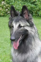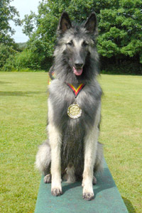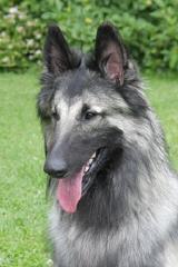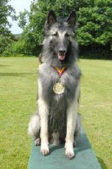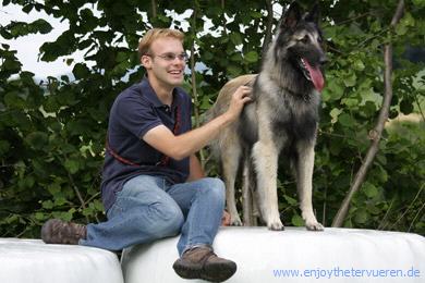2 Jahre alt, großer Rüde, Scherengebiss, guter Knochenbau, gerader Rücken, abfallende Kruppe mit zu hoch angesetzter Rute, Brust sollt tiefer sein, gut gewinkelt vorne, überwinkelt hinten, gutes Haarkleid, gute Farbe, könnte wärmer sein, guter Hals, genügend gemeißelter Kopf, mit guten Augen, unterbrochene Maske, wenig Stopp, Ohren breit etwas groß und könnten höher angesetzt sein, guter paralleler Stand, dreht die hintere linke Pfote aus, in der Bewegung paddelnd, wenig ausgreifend und offen hinten.