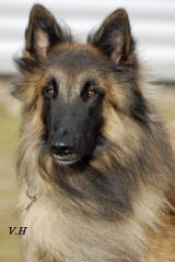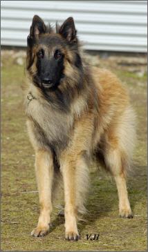 Zangengebiss, hellbrauner Rüde, leicht charbonniert, noch gute Maske, dunkle Augen, dreieckige Ohren, sollten enger stehen,