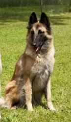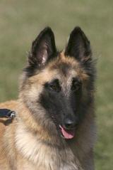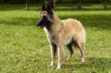 Scherengebiss, 2 Jahre, korrekter, femininer Typ, gerader Rücken, gute Brusttiefe, passende Knochen, parallele Front, ziemlich stark gewinkelte Hinterhand , Pfoten leicht ausdrehend, passender Kopf, dunkles Auge, korrektes Haar, in der Bewegung hinten etwas eng.