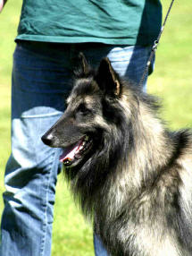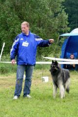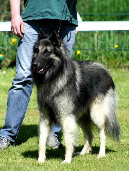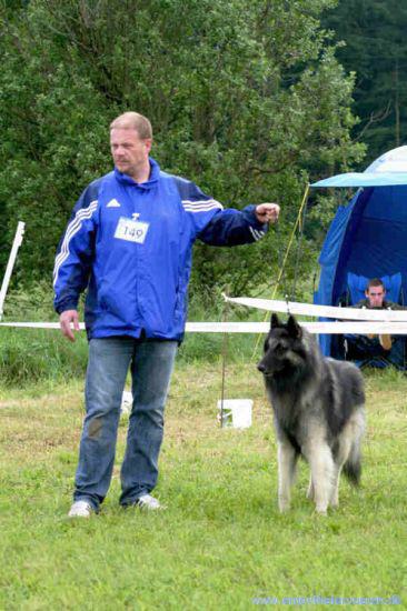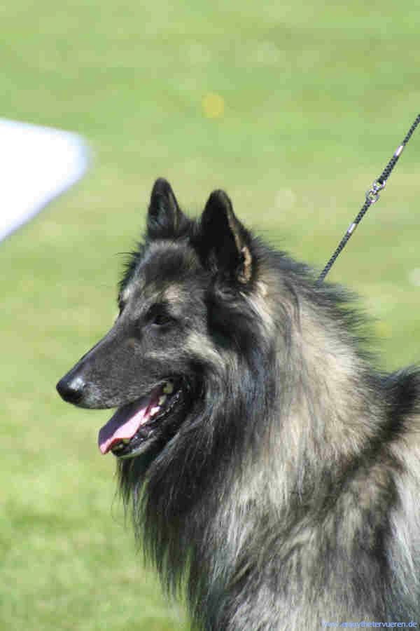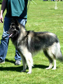 Gut dreijähriger Rüde, von elegantem Typ, guter Knochenbau gute Substanz, gut abgesetzter Widerrist, guter Rücken mit leicht abfallender Kruppe, etwas lang in der Lendenregion, gute untere Linie, vorzügliche Nackenlinie und Kopfhaltung, Brust muss noch tiefer werden, Vorbrust etwas schmal, Kopf elegant mit guten Proportionen, vorzüglich gut gespaltener Fang, vorzügliches Pigment, trockene Wangen, Fang dürfte kräftiger sein, Augen dunkel, von guter Form, sollten schräger eingesetzt sein, gute, parallele Linien, Ohren vorzüglich, gut angesetzt, von guter Form, raumgreifendes Gangwerk, hinten etwas eng, vorne lose, Rute in der Bewegung hoch getragen.