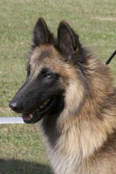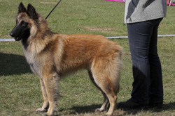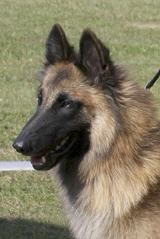 2-jähriger Rüde, noch in der Entwicklung stehend, ausdrucksvoller Kopf mit sehr guten parallelen Kopflinien, minimaler Stopp, mittelbraune, mandelförmige Augen, etwas längliche, vorzüglich angesetzte und getragene Ohren, sehr schöne Oberlinie und Unterlinie, Winkelungen vorne steil, hinten sehr gut, der Vordermittelfuß ist etwas weich, etwas langer Hintermittelfuß, Haarkleid heute leider nicht in optimaler Ausstellungskondition, noch zu wenig Fellfülle für einen Rüden, sehr schöne Farbe mit wenig Charbonnage, schönes regelmäßiges Gangwerk, Rüde zeigt sich freundlich und unbefangen, braucht noch Zeit für seine Entwicklung