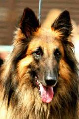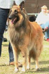 4 ½ Jahre, großer quadratischer Rüde, schön hochbeinig mit geradem Rücken, gute Kruppe, gut gewinkelt, Brust könnte etwas tiefer sein, schöner Hals, Rutenansatz ein wenig hoch, schöne Farbe, schönes Haarkleid, Kopf genügend ziseliert, lang, etwas spitze Schnauze, braune mandelförmige Augen, genügend Stopp, mittelgroße Ohren, etwas tief angesetzt, leichte Ramsnase, wenig ausgreifendes Gangwerk.