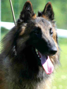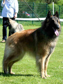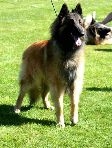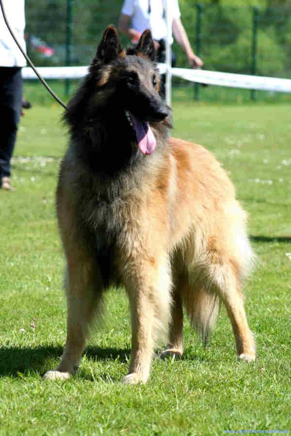 Komplettes Zangengebiss, gute Größe, Körper ein bisschen zu lang, fauve charbonniert, etwas steile Schulter, guter Knochenbau, guter Stand, geschlossene Pfoten, extrem abfallende und flache Kruppe, sehr guter Hals, guter Widerrist, langer Kopf, mittlere Maske, Ramsnase, braune Augen, leichte Schlitzaugen, kleine Ohren gut getragen, der Stopp ist verwischt, korrekter Parallelismus, gute Substanz, vorzügliche Vorführung, vorzüglicher Charakter, gutes seitliches Gangwerk, gut getragene Rute, guter Schub hinten, lose Ellenbogen während des Laufes.